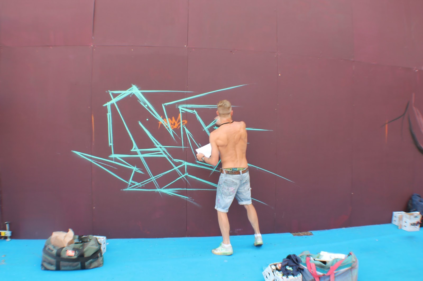 The festival doors opened on Saturday afternoon, but painting did not start until around 6pm, giving me some time to conduct interviews before painting began in earnest and writers were working against the clock, and the sun, to finish their pieces. I found a cluster of Spaniards, by language, and first talked with Icat, from Andalusia. Her name, she explained, comes from a conjunction of her given name, Mónica, and her love of cats, thus, Icat. The scene in Andalusia, she told me, is relatively small, and it is at festivals like MOS that one can build connections and learn new styles. Her style is more of a wildstyle, with exaggerated and bending letters. I then met Pinche, who hails from Madrid. His piece ended up being a quasi-realist reference to the festival theme, "Mind over matter," with a portrait of a man, half of the face flesh, and half bone, and the words, "mind/matter" written in ink pen. The scene in Madrid, Pinche noted, was "very harsh" and the city "very grey" with a great deal of buffing and tough police response.